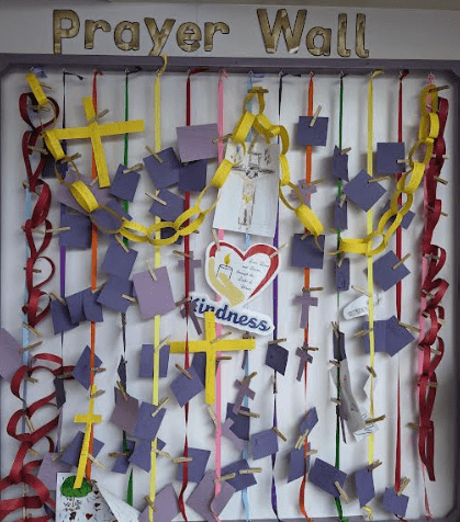 Prayer wall- Children can write their prayers and share them in the central prayer area of the school – this is located next to the school chapel.